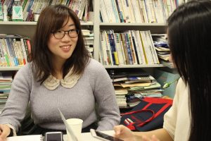 関西学院大学の学生3人と定藤教授とみやこむとのコラボ企画についてお話しされているところを取材させていただきました。