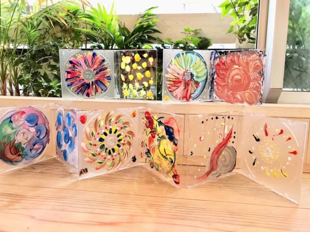 前半は赤青黄の絵の具を使って混色実験、後半は3色絵の具で自由にステンドグラス風を作ります。
