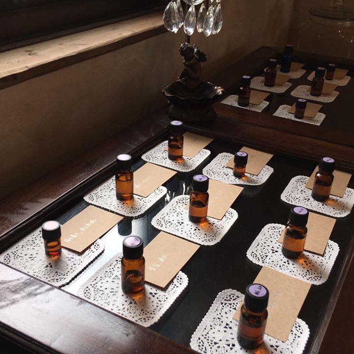 店内にはまるで宝さがしのように贅沢な精油を使った香りがあちこちにセッティングされています。 展示された香りを体感していただきお気に入りをセレクトするだけで、アロマテラピストがオンリーワンのあなたのためのアロマミストをお作りします。